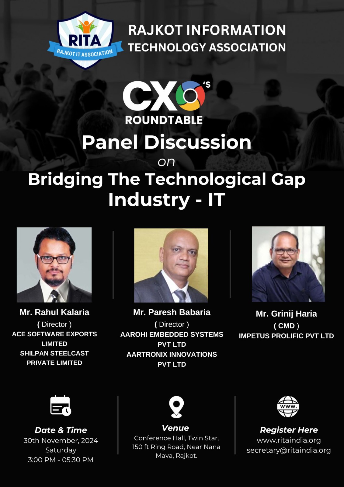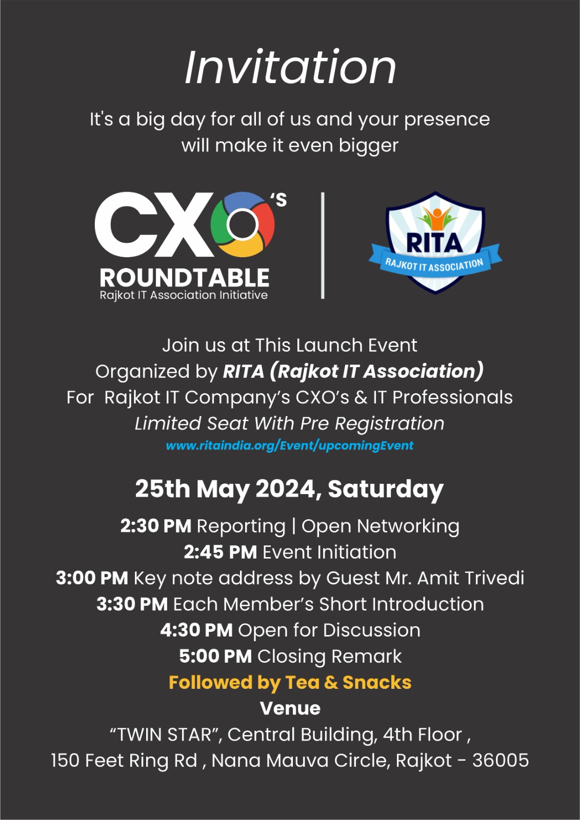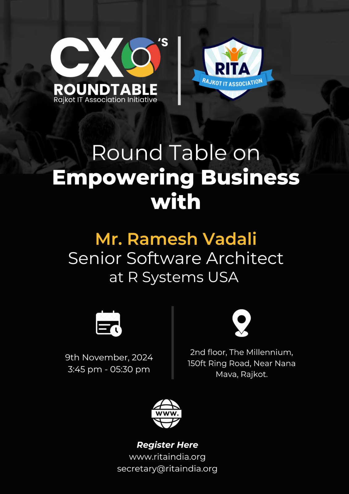 RITA invites all Entrepreneurs from the IT ecosystem from Rajkot/Saurashtra to witness the curtain raiser of the CXO's Roundtable. Let us build a robust synergy for exponential growth.