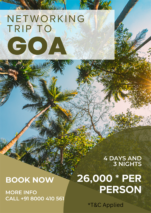 Get ready for an incredible mix of relaxation, exploration, and networking as we embark on this exciting journey to Goa from 22nd to 25th January 2025!   From breathtaking sunsets and thrilling adventures to meaningful networking sessions on the beach, this trip promises memories and connections that will last a lifetime. Day 1: 22nd January 2025 Day 2: 23rd January 2025 "Discover Goa: Adventure Meets Heritage" Day 3: 24th January 2025 "Network & Bond: Building Connections on the Beach" Day 4: 25th January 2025 "Farewell Goa: Memories to Cherish" Don’t miss this perfect blend of business and pleasure! Contact - +91 8000 410 561 *Amounts and timelines may change based on the program; all details are tentative. Lunch, transportation, sightseeing, and any additional charges are not included and will incur extra costs.Highlights: