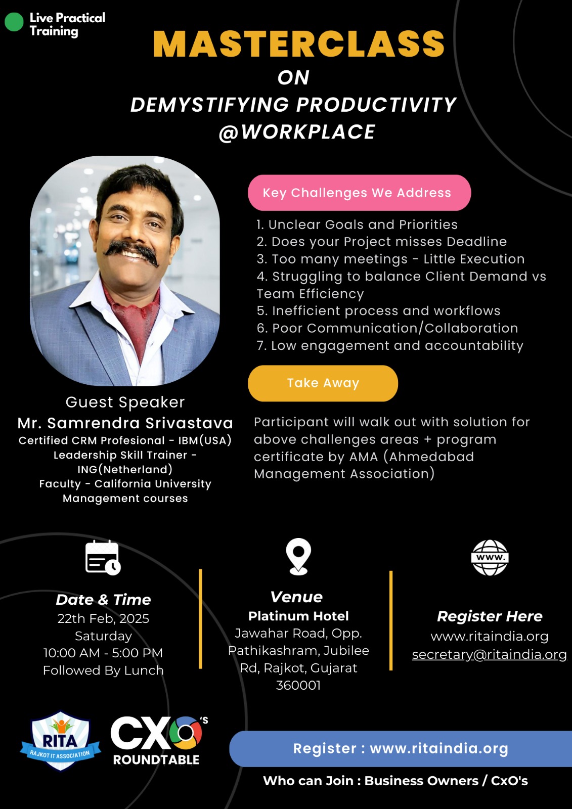 📍 Venue: Conference Hall, Central Tower, 4th Floor, Twin Star Building, 150 ft Ring Road, Near Nana Mava Circle, Rajkot-5
